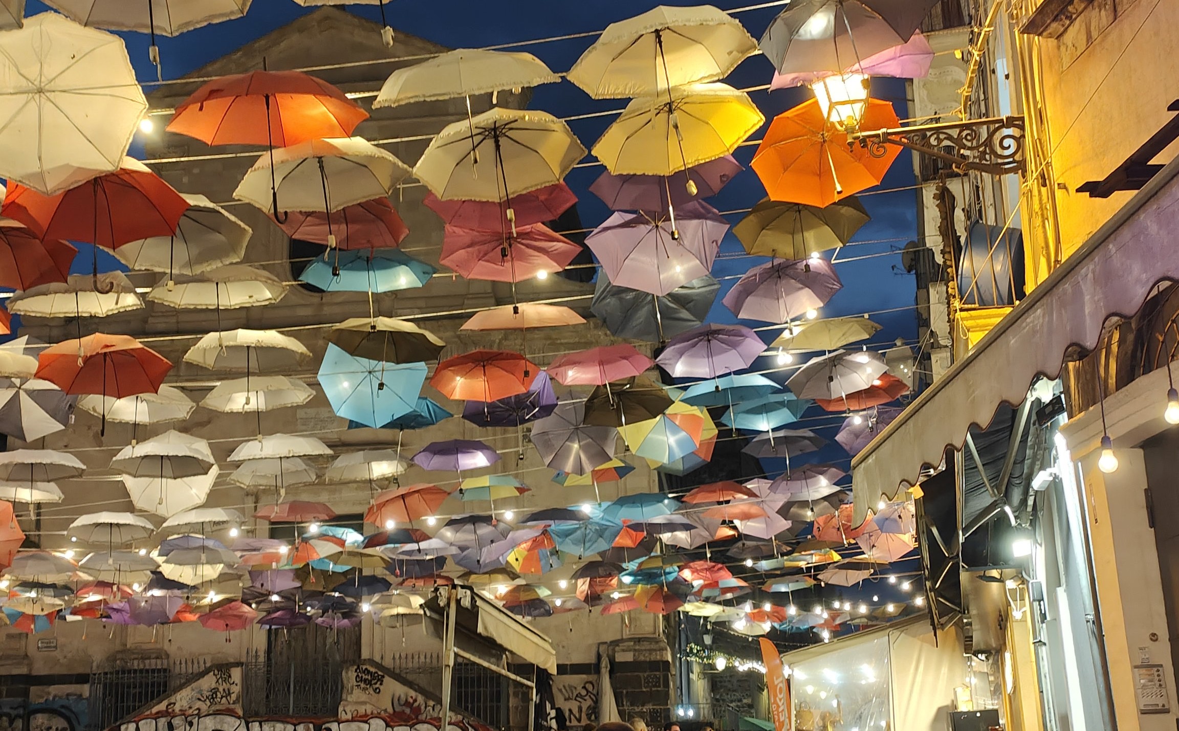 Dopo il successo iniziale in Portogallo, la tendenza si è diffusa in tutto il mondo, compresa l’Italia, a partire dal 2013. Le città di tutto il mondo hanno adottato questa pratica, trasformando i loro vicoli e strade in un arcobaleno di colori sospeso. Nella foto sopra, per esempio, il centro storico di Catania abbellito con gli ombrelli di ogni colore.