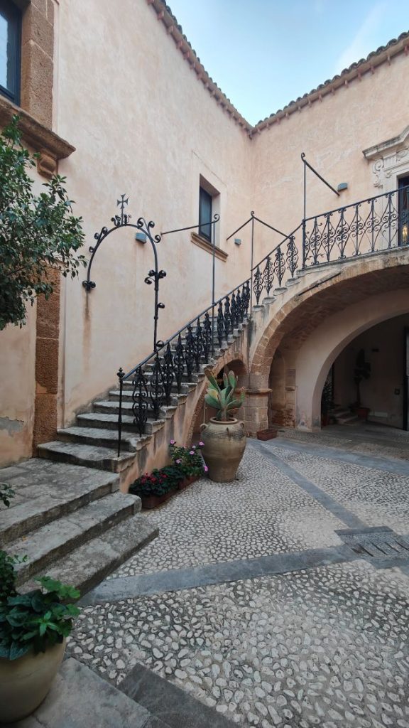L’architettura di Palazzo Panitteri è un perfetto esempio del gusto barocco siciliano, caratterizzato da linee sobrie e imponenti che sottolineano la solidità dell’edificio. La facciata esterna, semplice e austera, presenta un grande portale in pietra, che dà accesso a un cortile interno adornato da arcate e logge, tipiche delle dimore siciliane dell’epoca. Questo cortile è un’oasi di tranquillità, dove i visitatori possono ammirare l’armonia degli spazi e i dettagli architettonici che arricchiscono l’intero edificio.