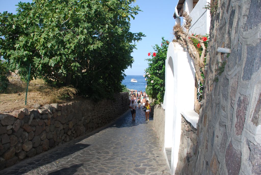Le case imbiancate a calce con porte e finestre azzurre, gli stretti vicoli e le buganvillee che le adornano conferiscono a Panarea tutto il fascino delle isole greche del Mar Egeo.